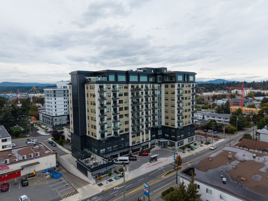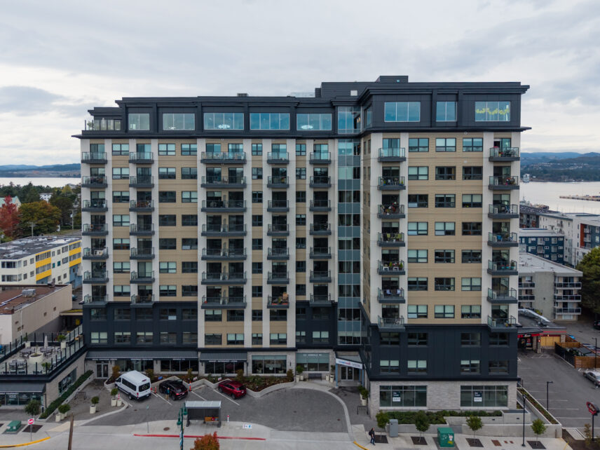 Welcome to Chartwell Vista, where 55+ living is redefined through comfort, independence, and vibrant community. This bright, west-facing 10th-floor suite, the largest floor plan in the building, offers panoramic ocean, city, and mountain views that bathe the home in natural light. Designed with ease and accessibility in mind, the open concept floor plan flows seamlessly from living and dining to the modern kitchen, featuring quartz countertops, two-tone cabinetry, paneled fridge/freezer/dishwasher, and wall oven with induction cooktop.