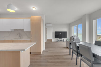 Welcome to Chartwell Vista, where 55+ living is redefined through comfort, independence, and vibrant community. This bright, west-facing 10th-floor suite, the largest floor plan in the building, offers panoramic ocean, city, and mountain views that bathe the home in natural light. Designed with ease and accessibility in mind, the open concept floor plan flows seamlessly from living and dining to the modern kitchen, featuring quartz countertops, two-tone cabinetry, paneled fridge/freezer/dishwasher, and wall oven with induction cooktop.