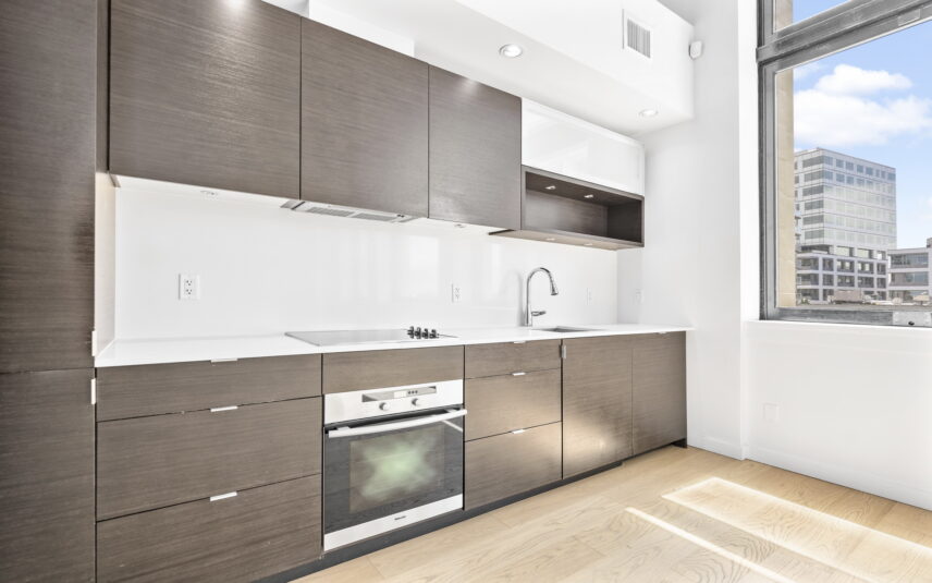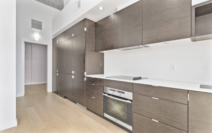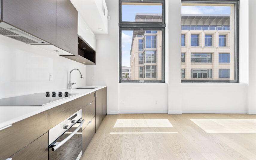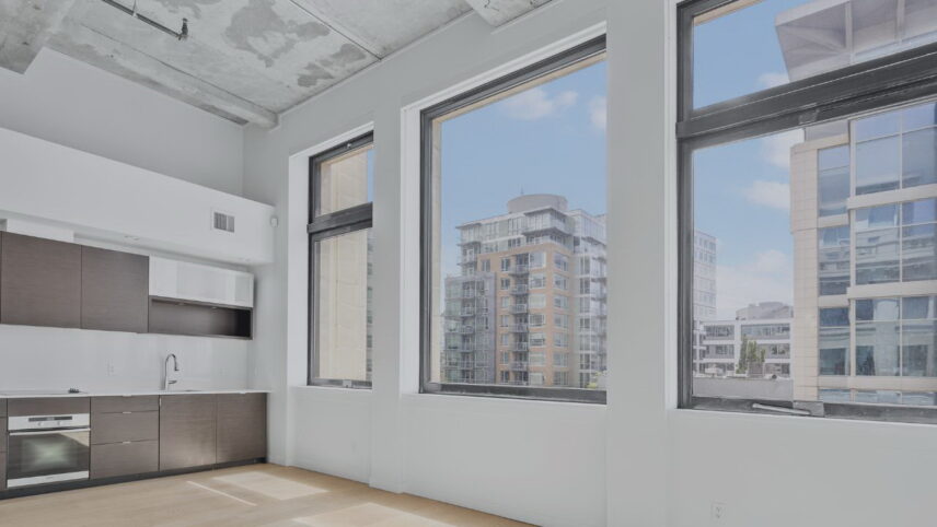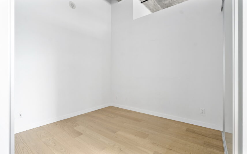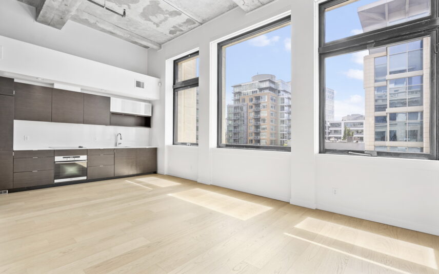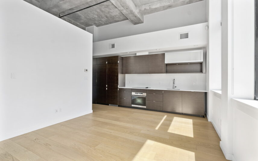 Prime downtown location in the historic Hudson. This one-bedroom plus den unit showcases an airy contemporary design spread across 700+ sq ft. The space is accentuated by 14-foot exposed concrete ceilings, and beautifully restored oversized windows with a southern exposure creating a luminous ambiance. The kitchen features sleek dark oak cabinets and seamlessly integrated Miele appliances. Ample built-in cabinets, a spacious pantry offer excellent storage versatility and convenience. The bedroom is equipped with opaque glass sliders for privacy, while the bathroom boasts luxurious amenities including a soaker tub, shower, in-floor heating, and stylish terrazzo tile flooring. With geothermal heating and cooling systems, comfort is ensured throughout the year. Breathtaking panoramic vistas await on the 14,000 square foot rooftop deck along with lounge, picnic area and community BBQ. Parking and storage are included, and the building is pet friendly. Hudson Market, Chinatown and all the delights of downtown are at your doorstep!